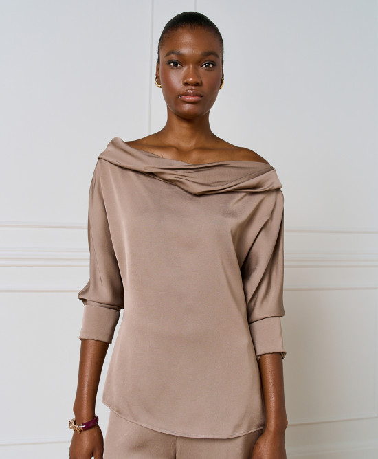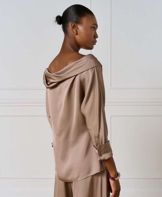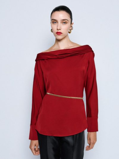 Off-the-shoulder μπλούζα με μακριά μανίκια και κουμπιά στις μανσέτες. Αποτελεί ιδανική επιλογή για κάθε κομψή γυναικεία γκαρνταρόμπα.