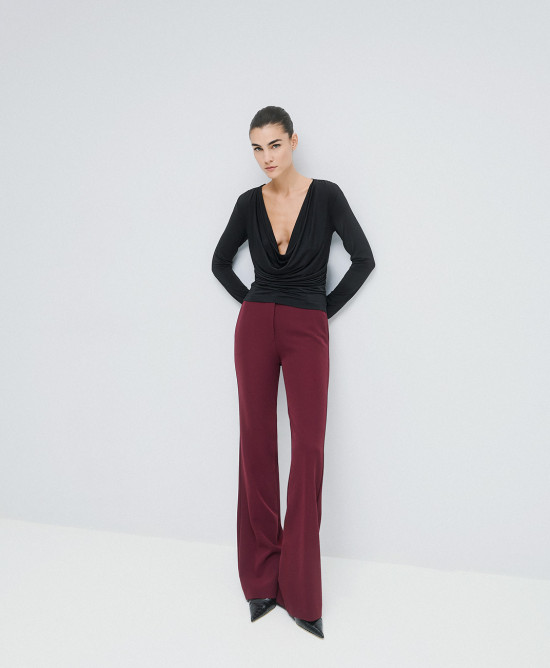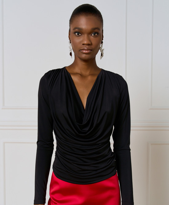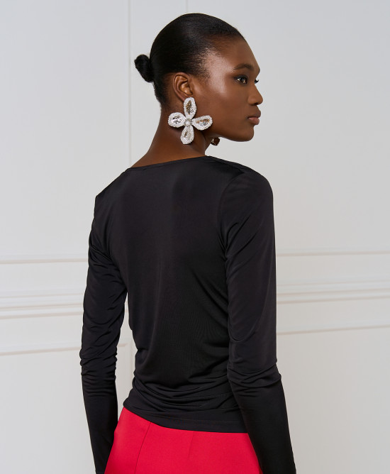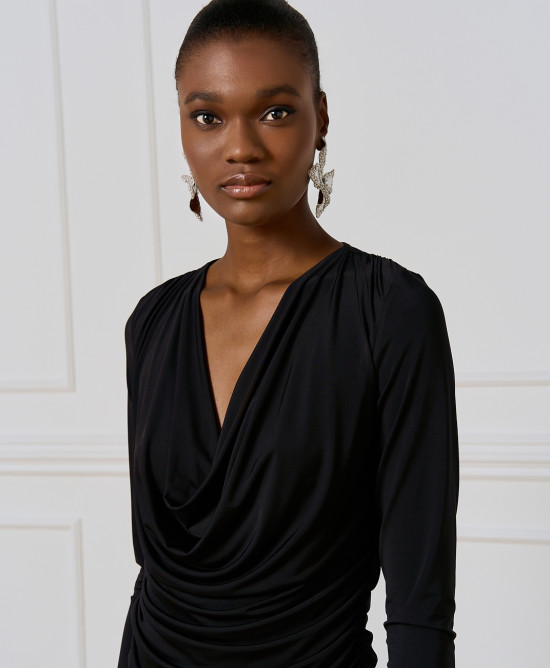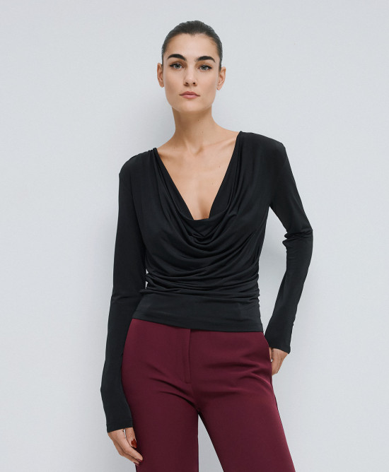 Μακρυμάνικη εφαρμοστή μπλούζα με ντραπέ λαιμόκοψη και λεπτομέρειες από σούρες. Αποτελεί ιδανική επιλογή για κομψές και στιλάτες εμφανίσεις.