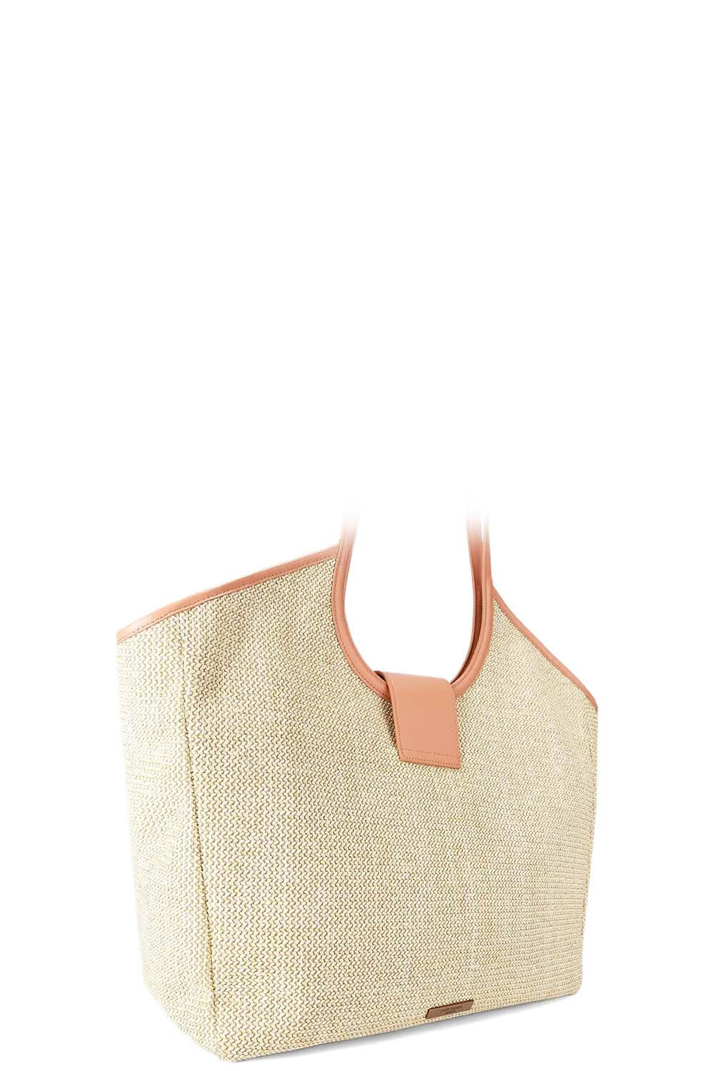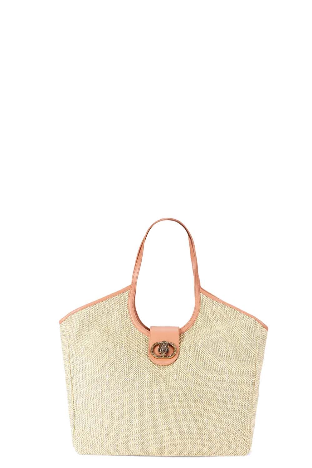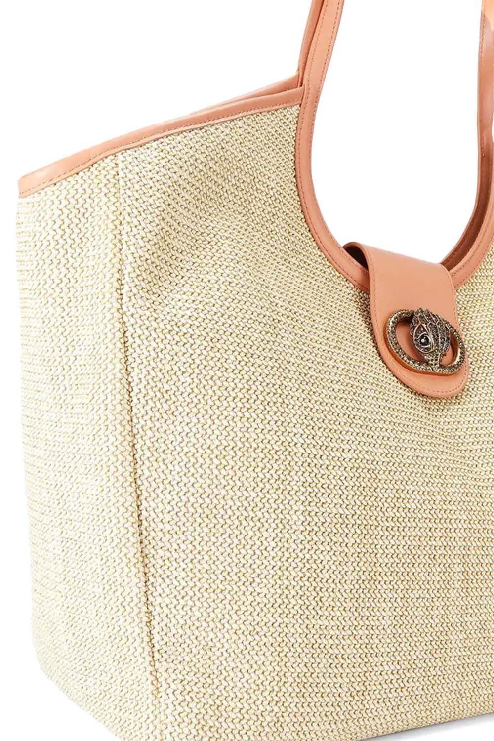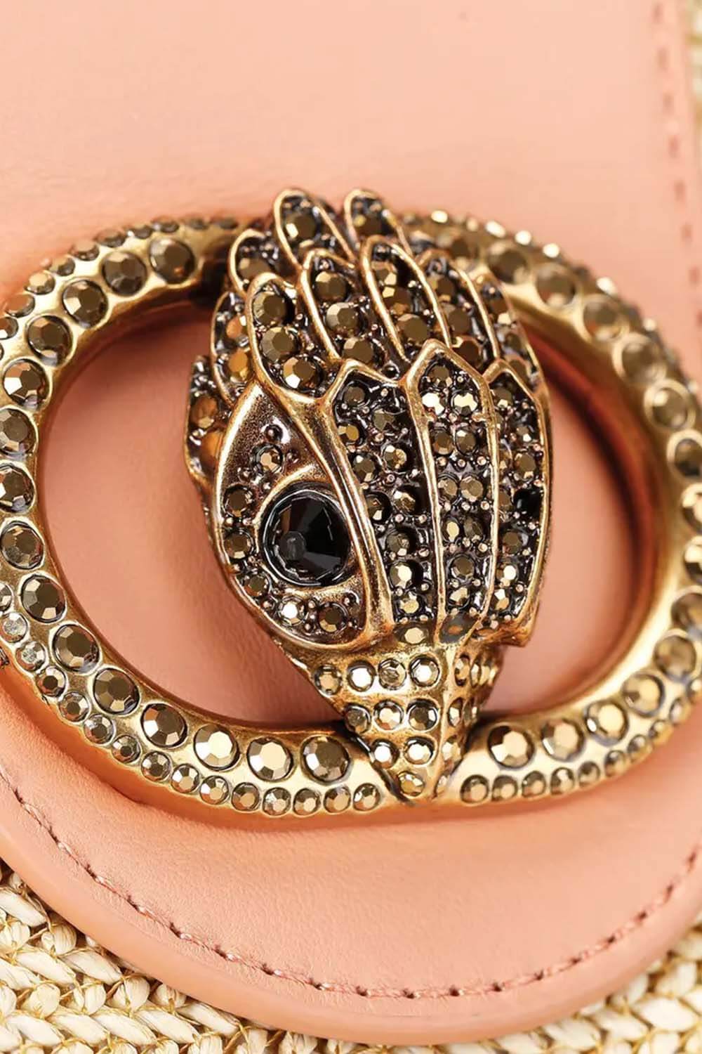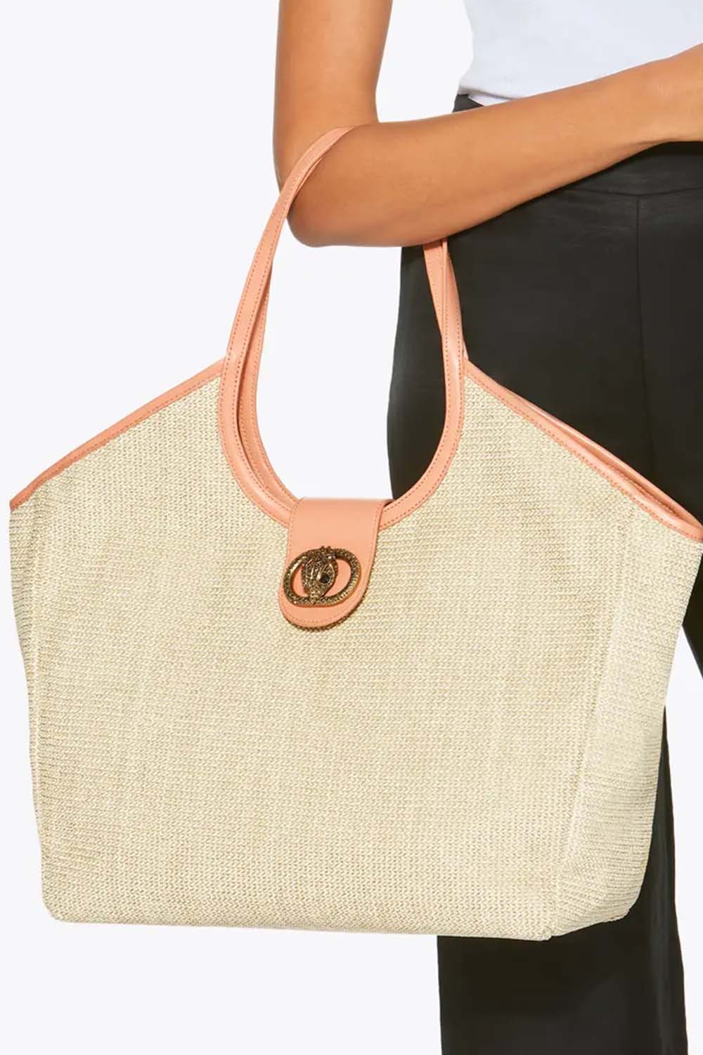 The Large Chelsea Tote Bag is crafted from a neutral woven raffia. There is an antiqued brass crystal embellished oval trim with eagle head at the centre of the flap closure.