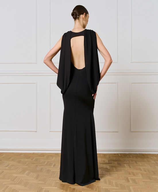 Μάξι φόρεμα με μακριά μανίκια και ανοιχτούς ώμους. Διαθέτει ιδιαίτερο άνοιγμα στην πλάτη. Επιλέξτε το για εντυπωσιακές επίσημες εμφανίσεις.