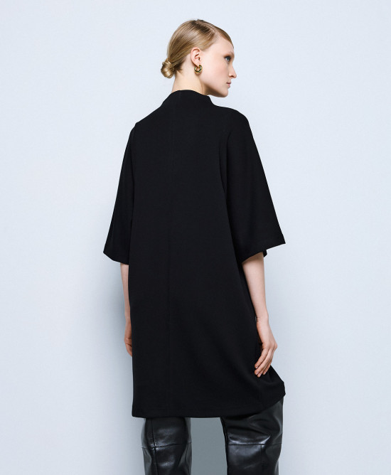 Φόρεμα μίντι με ψηλό λαιμό. Διαθέτει 3/4 μανίκια και διακοσμητικές ραφές. Ιδανική επιλογή για κομψές και άνετες εμφανίσεις.