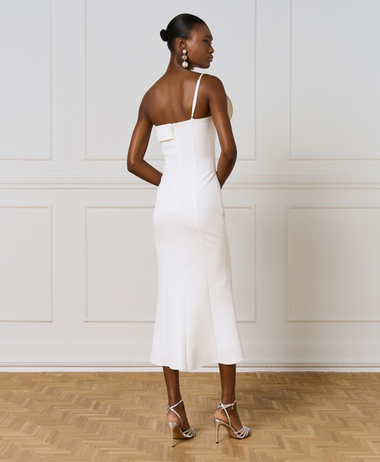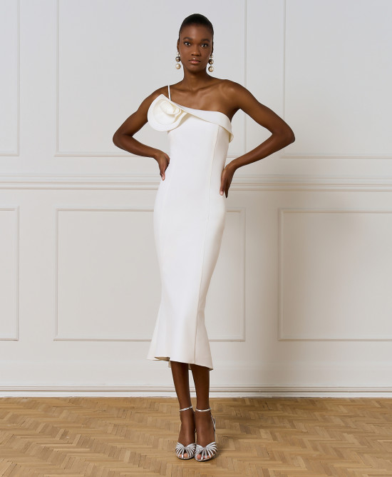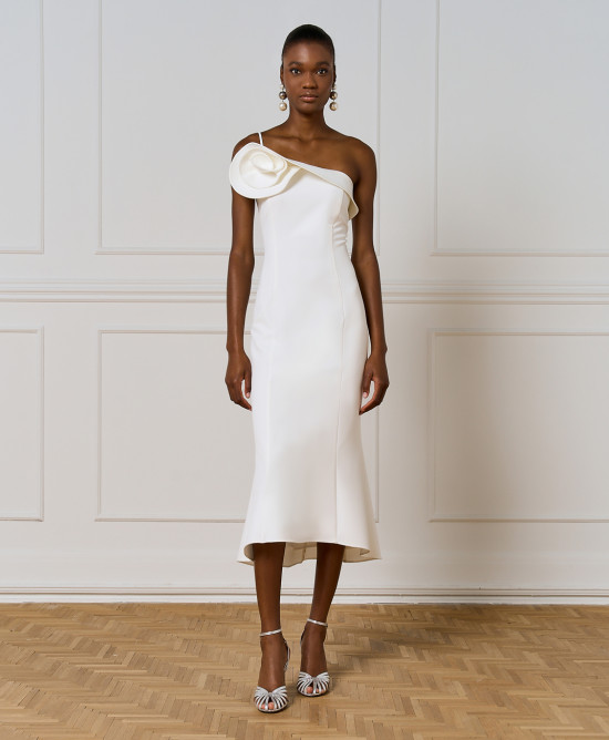 Μακρύ φόρεμα με έναν ώμο και λουλούδι από βολάν λεπτομέρειες. Διαθέτει διακοσμητικές ραφές και κλείσιμο με κρυφό φερμουάρ πίσω. Αποτελεί μια εντυπωσιακή επιλογή για special occasion looks.