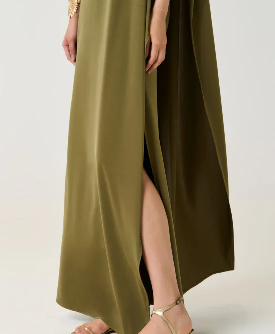 Μάξι φόρεμα με έναν ώμο και ενσωματωμένη ντραπέ λεπτομέρεια τύπου κάπας που αγκαλιάζει τον ώμο και συνεχίζει μέχρι το τελείωμα. Διαθέτει σκίσιμο στο πλάι και μεταλλική λεπτομέρεια με σούρες στον ώμο.