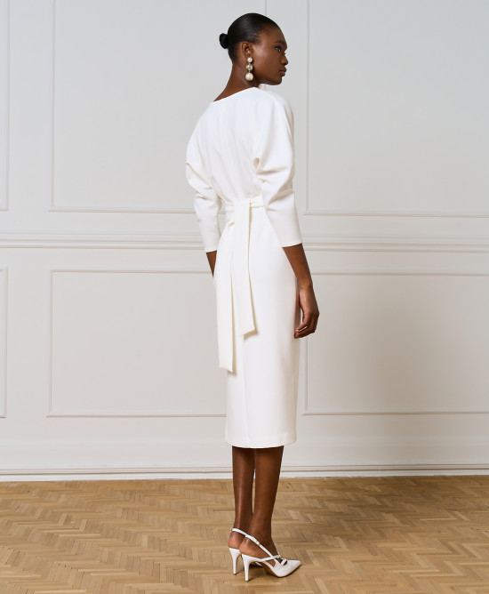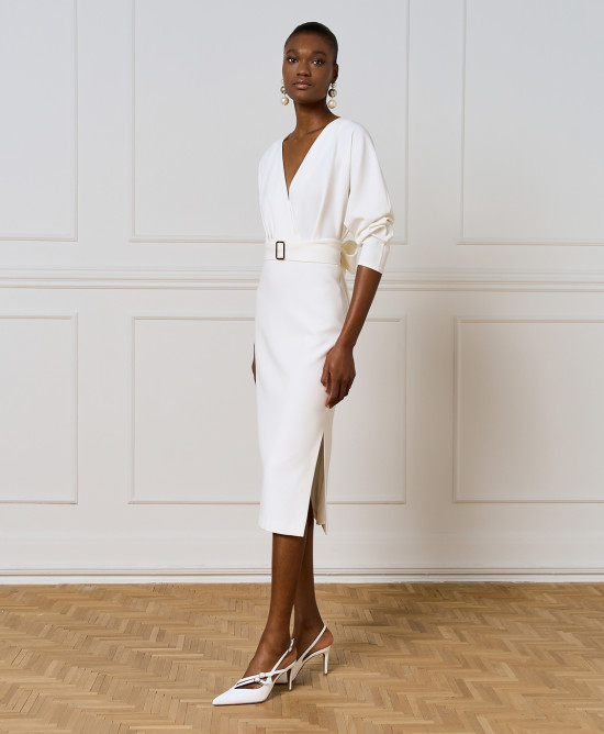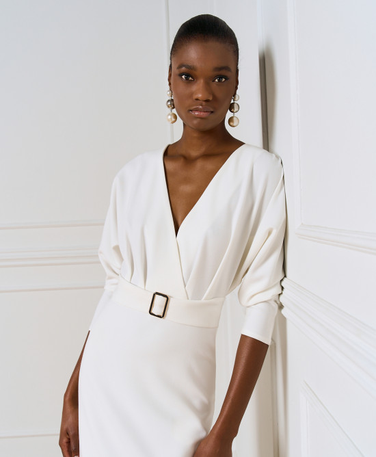 Μίντι φόρεμα με κρουαζέ V λαιμόκοψη και μακριά μανίκια. Διαθέτει αποσπώμενη ζώνη με μεταλλική τόκα και λεπτομέρειες με πιέτες μπροστά. Επιλέξτε το για κομψές εμφανίσεις.