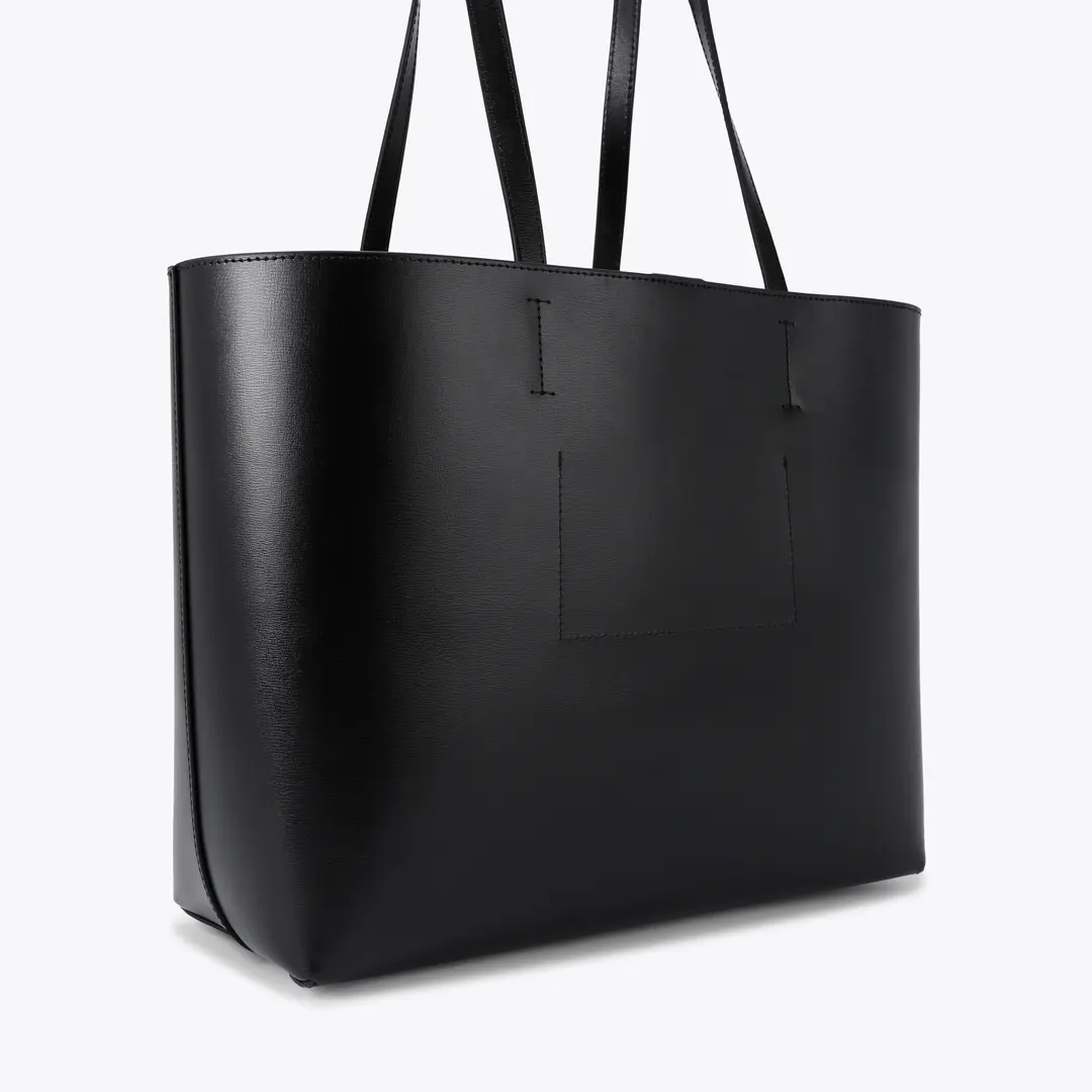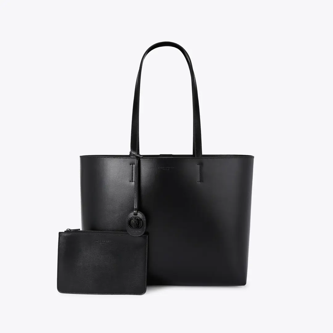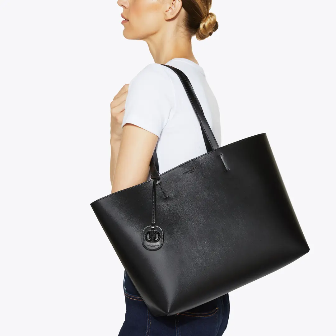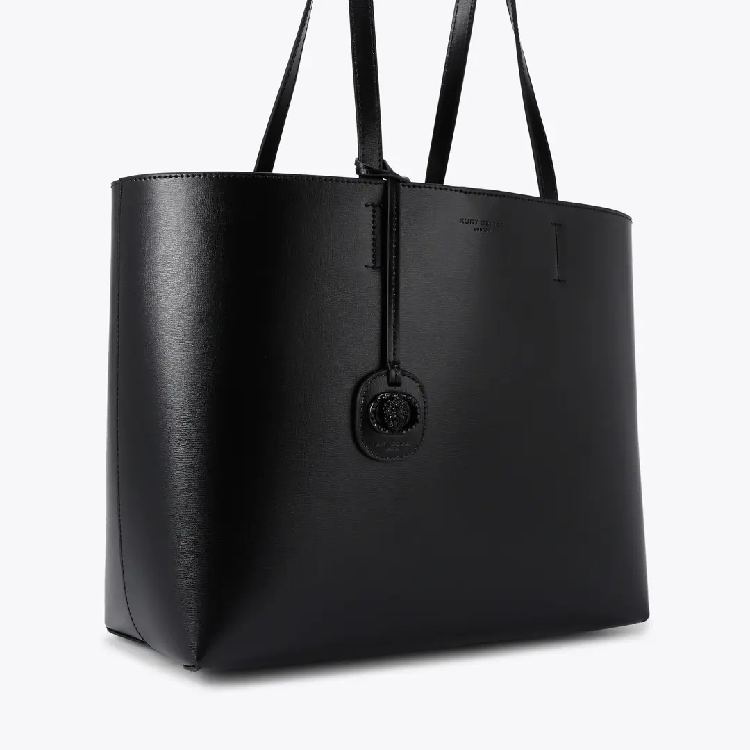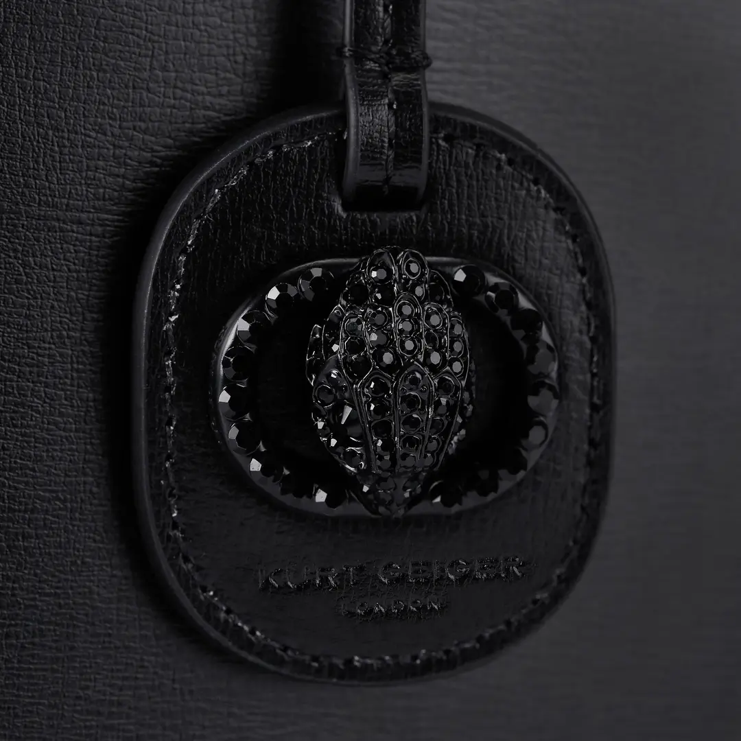 The Drench Chelsea Shopping Bag features a black textured leather exterior with slight structure. There is subtle embossed branding on the front and a crystal embellished black oval trim with central eagle head on the luggage tag.