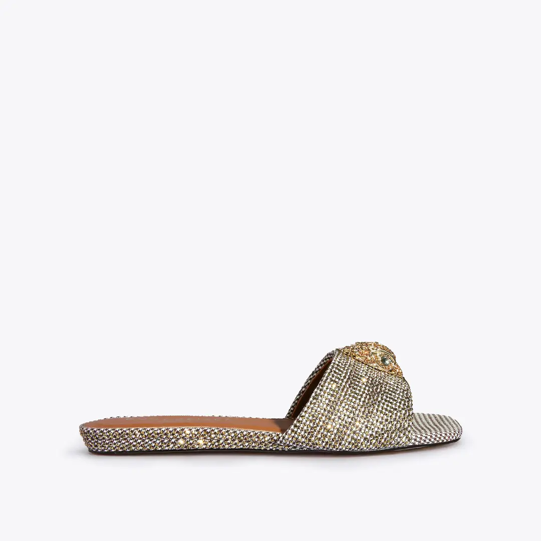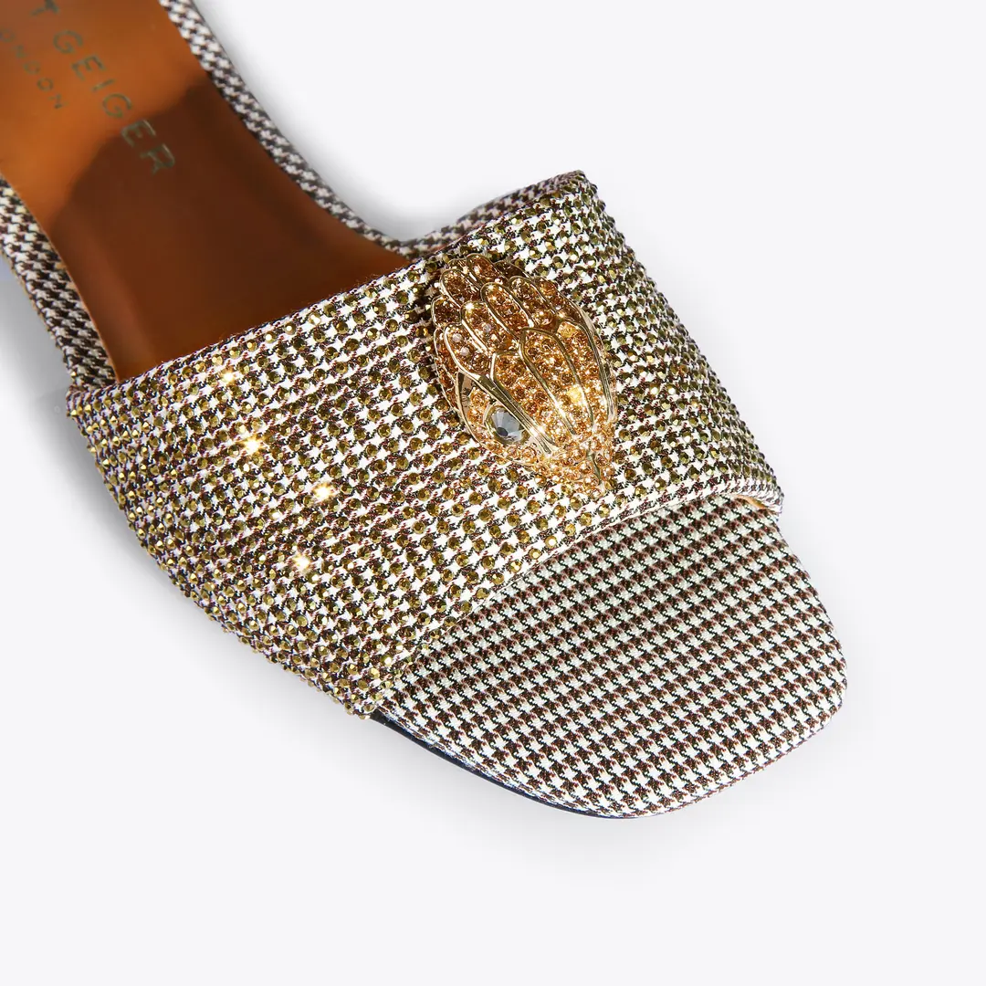 The Kensington Flat Sandal, an addition to the Kensington Collection, is crafted from a beige houndstooth fabric topped with opaque gold crystals. The gold Eagle head features gold crystals and black bead eyes on the strap.