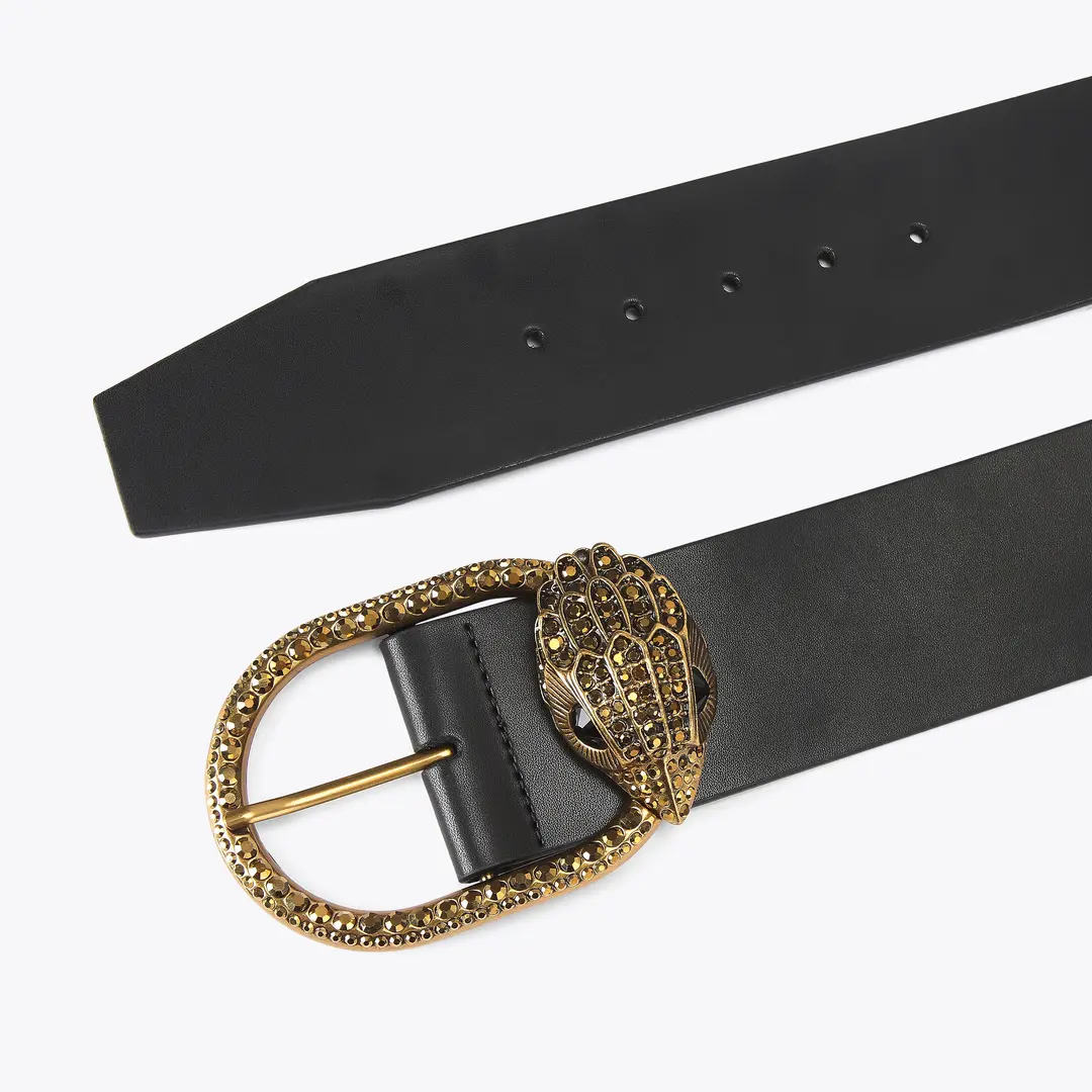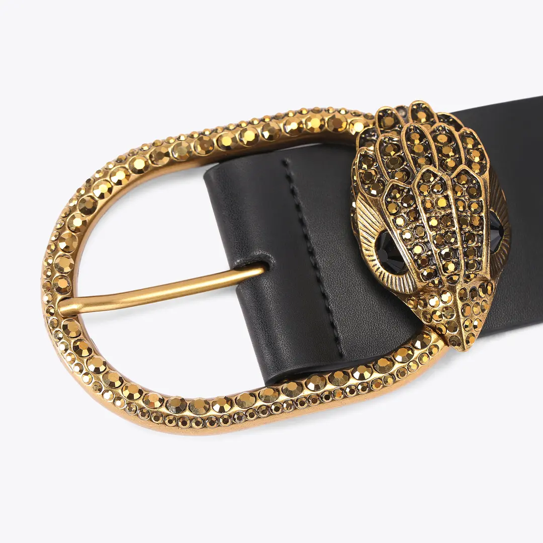 This Mayfair 60 Belt features a smooth black leather belt. The antiqued brass eagle head features crystals and fastens the belt.