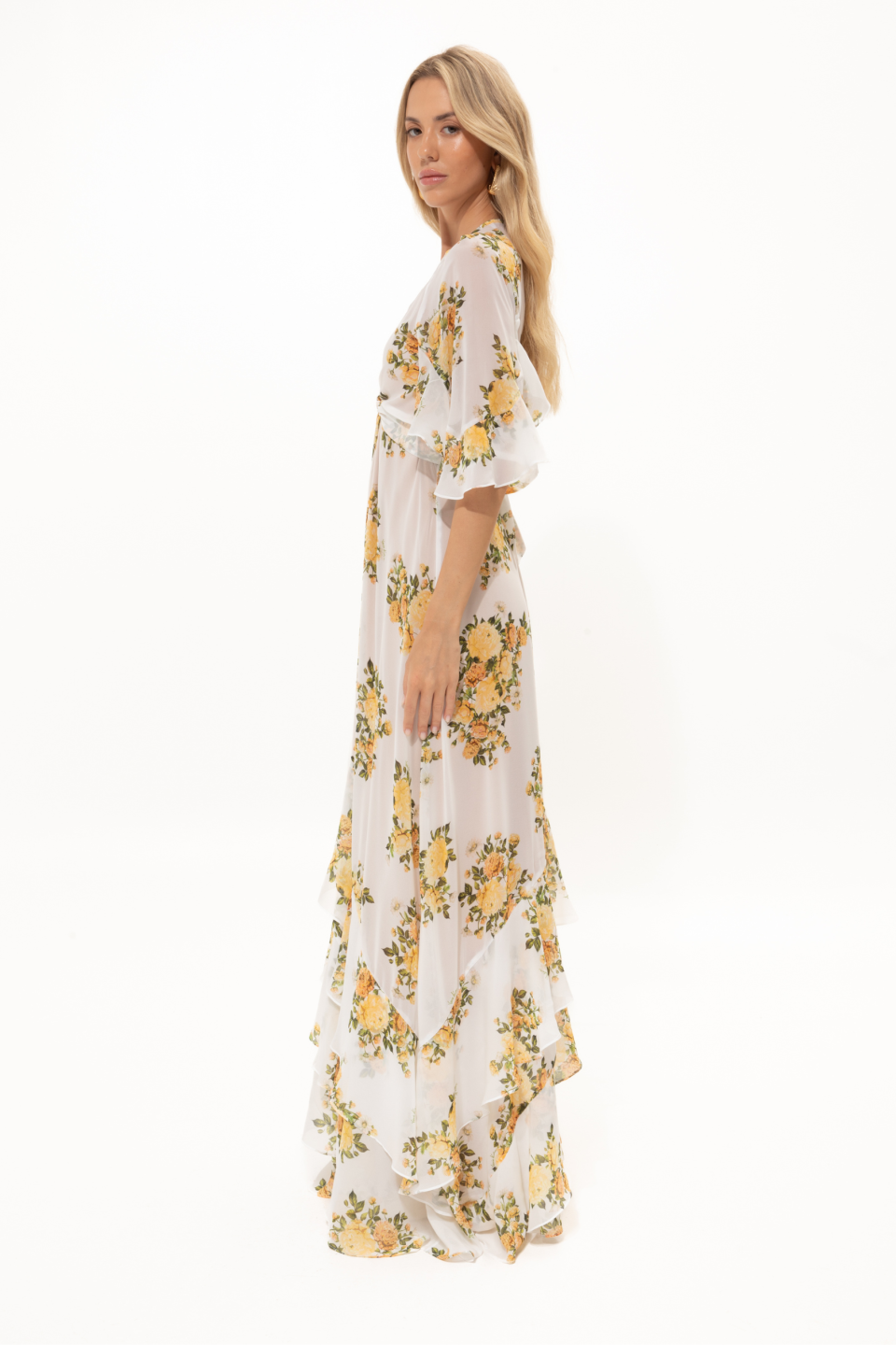 Refine your style with this season’s “June Dress” in a floral print, adorned with graceful ruffles. This stunning piece features a harmonious blend of bright yellow flowers in a white backdrop. The ruffles add a touch of romance and movement, perfect for making a statement at any special occasion.